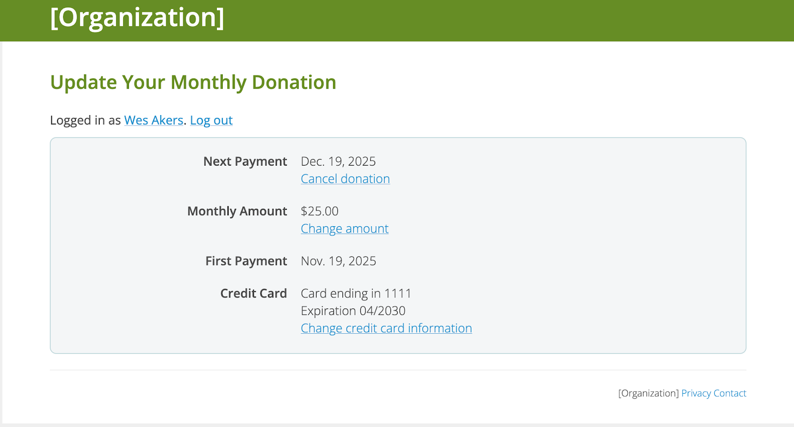 After logging in, the donor will be able to update or cancel their recurring donation.