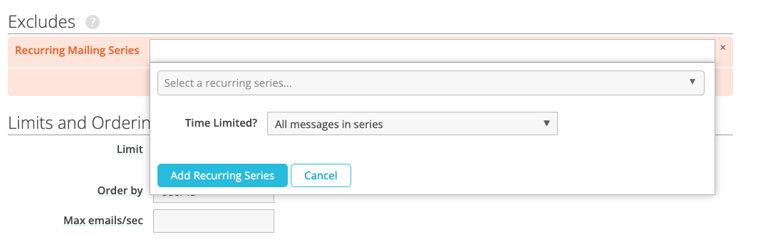 To do so, select “Recurring Mailing Series” from the Excludes section of the mailing and find the recurring series you want to exclude in the pulldown. Most of the time, you’ll want to exclude anyone who has ever received the series, but you can also exclude people who have received it within a designated number of days using the “Time Limited” pulldown.