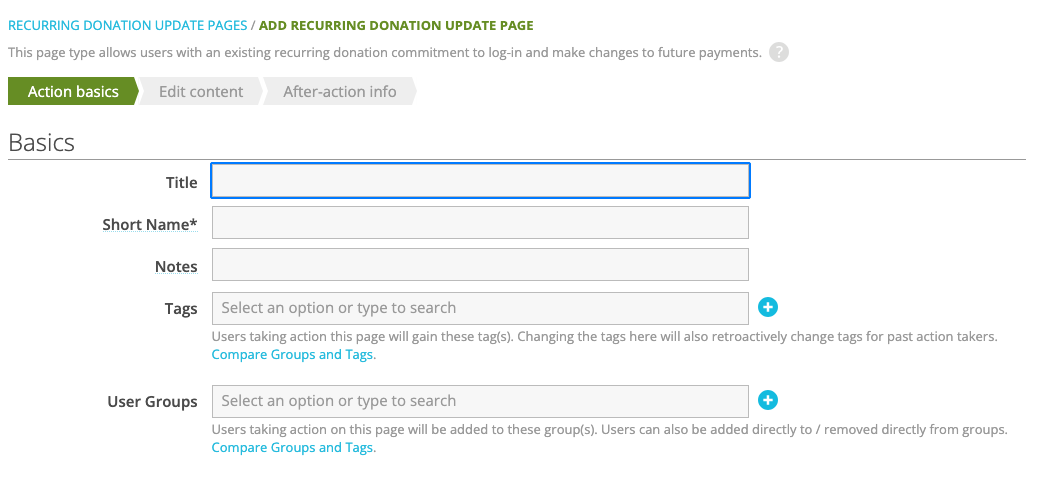 You can also create pages where your users can manage their existing recurring commitments (including changing their credit card number, billing address, or amount) or cancel them. These are called “Update” and “Cancel” page types, and you have to create one of each. In order to see their donation, a donor will have to set a password and login, but we have some tricks to make this easier as well. Read on to learn more.